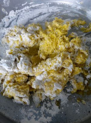 2. 将糯米粉加入南瓜泥内,用筷子搅拌成雪花状后,揉成光滑面团。