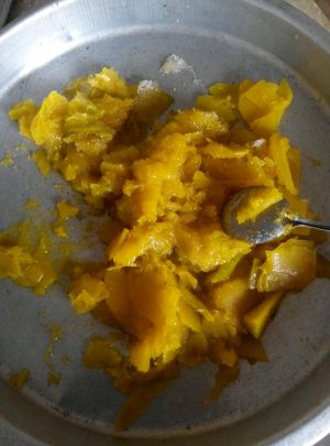 1. 南瓜洗净去皮瓤切小块,上锅蒸至软烂后趁热捣成泥(我用的是小金瓜,感觉很甜了,就没加糖,如果是普通的南瓜可以适量加些糖)。
