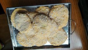 分成一个个的剂子,放掌心揉圆再拍扁,然后粘上事先准备的白芝麻就成了这个样子了