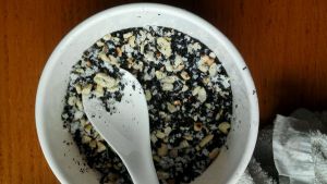 2.加入花生芝麻白砂糖搅拌,根据个人口味,待用。