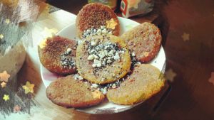 5.成品,剩下的馅料做装饰,南瓜饼放凉点会好吃点,也不油,希望你们喜欢。