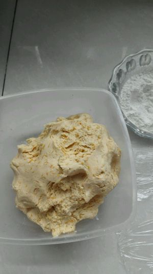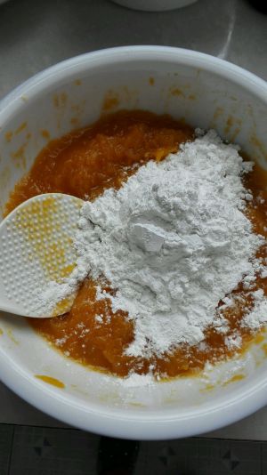 慢慢往南瓜泥里加入糯米粉,加一点搅拌一会儿,保证混合均匀,硬度适中。