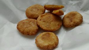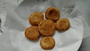 也可以用油炸,就是像上面步骤,做成面团。一个一个放下油锅,这是成品。
