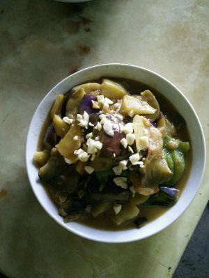 倒入少许油把葱姜青椒倒入翻炒下,再倒入土豆和茄子翻炒,加入盐糖,酱油翻炒下即可出锅!