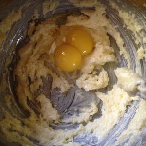 加入白糖搅拌成颜色变白,加入鸡蛋继续搅均匀