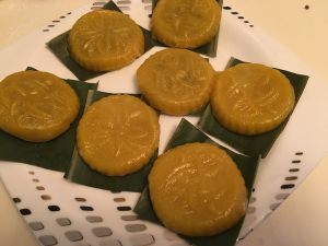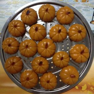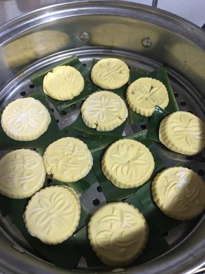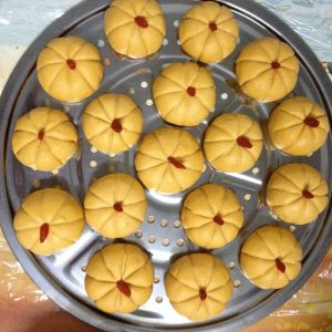 按好成型的南瓜饼,在上加上一粒枸杞更美观哦!现在放去蒸,水滚后放入蒸15分钟即可(怕不熟的可以蒸20分钟)