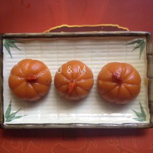 揉成一个个小丸子压扁,放入椰蓉馅包好揉圆型,用牙签在上面按成南瓜型