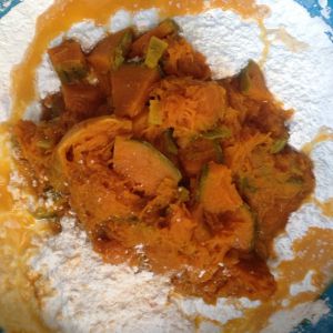 加入适量糯米粉,与南瓜泥混合,揉成南瓜面,直至不粘手