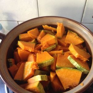 馅做好了,现在把南瓜削皮切片放入煲里煲熟,加入少少水。蒸熟也可以