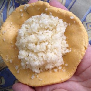 捣均匀之后,分出一部分当作南瓜饼的夹心(不要夹心的就不用分,直接做下一步)