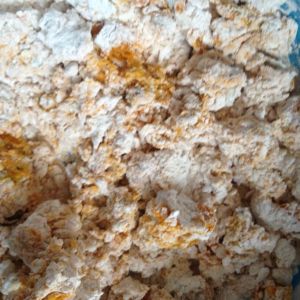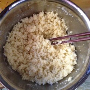 把蒸好的南瓜用筷子搅成南瓜泥,放凉后加入白糖和糯米粉,糯米粉和南瓜的比例大概是1:1