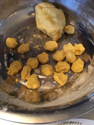 用手揪出一个一个的小面团,压成南瓜饼(也可以在饼里加入枣泥或是豆沙后再压成南瓜饼)