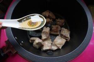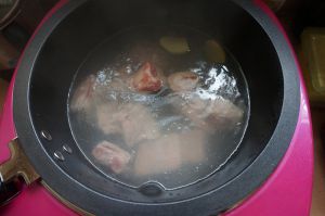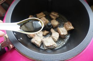 待着色完成后加热水至没过排骨,加入酱油,料酒,生姜,调小火候,盖锅盖炖煮收汁。