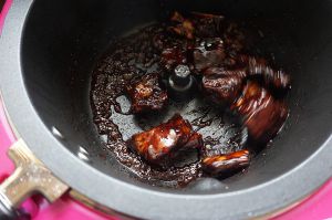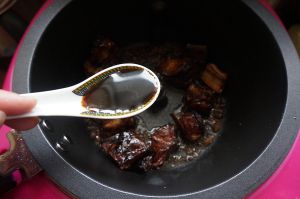 加生抽、老抽、水,水差不多没过小排,烧开,再小火。差不多半小时(中间试吃一下是否熟了)再加冰糖,基本稠干酱油,最后加醋。