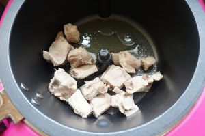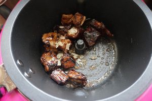 肋排放入(按炒菜)煸炒到肉质金黄,依次倒入料酒