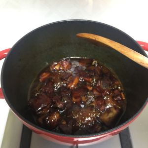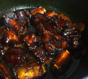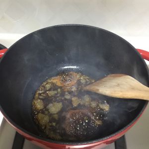 待汤汁烧到1/3时,挑出葱姜及香料,加入糖和剩余香醋,用老抽挑颜色。