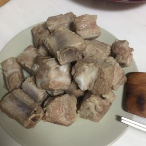 冷水锅入肋排,大火煮出血沫后,捞出洗净。