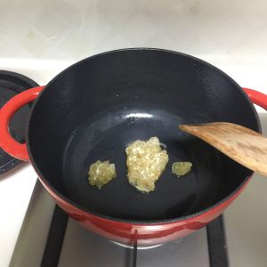 中小火翻炒至焦糖色 我用的是珐琅锅,聚热快,在冰糖完全融化前把肉放进去。放肉的时候要小心糖油溅出
