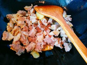 锅内下葱姜蒜,翻炒一会儿放入牛腩