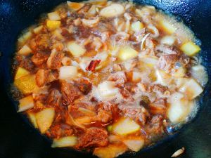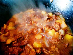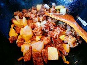 放入老抽,酱油,洋葱,土豆块,十三香,冰糖继续炒