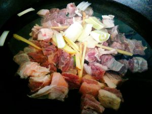葱姜,料酒,牛腩切块冷水下锅烧开