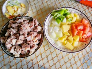 牛肉洗净 切成块状 加入料酒和酱油腌制十分左右 腌制期间 可以准备好葱姜蒜、土豆块、西红柿块和洋葱条