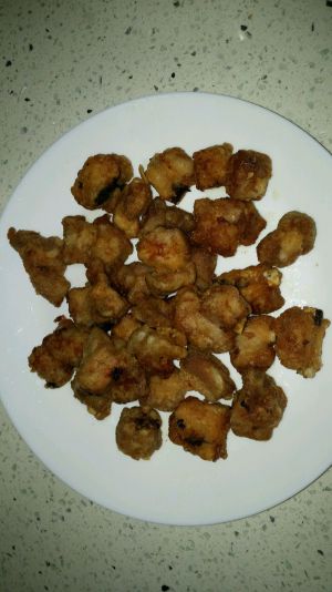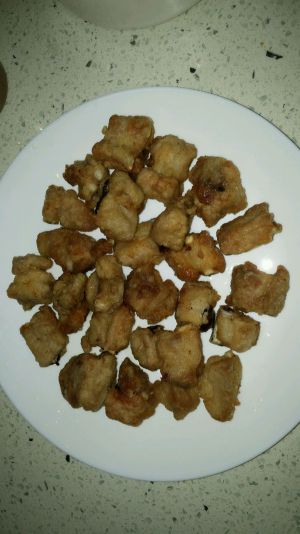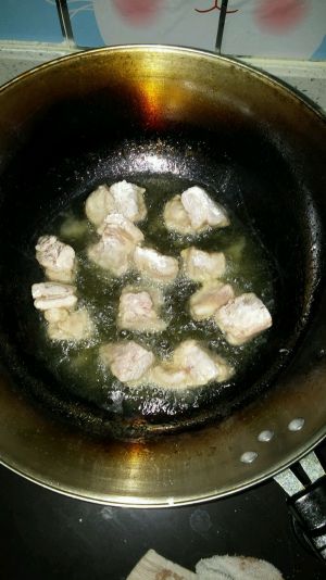 表面拍上干淀粉,逐块放入五成热的油锅(五成油温表现为油面出现波动,开始有烟出现)