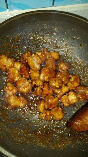 煎好的小排倒入油锅中,调好的汁倒入油锅,翻动挂汁,收汁,盛出。
