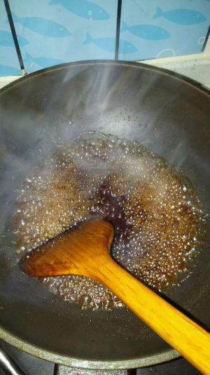 一把冰糖,放入油中,小火慢慢加热,不停翻动,直至全部融化,糖浆变成红褐色