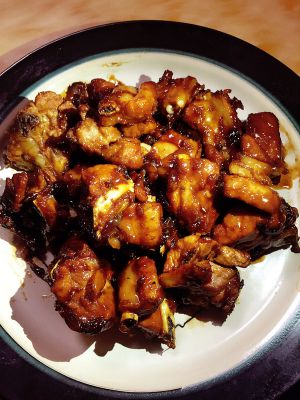 葱姜蒜爆炒,倒入调好的酱汁,翻炒,再倒入小排煸炒,加热水炖一个小时,收汁