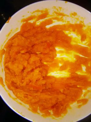 将南瓜搅成泥,加入白糖.面粉拌匀