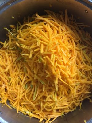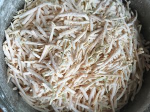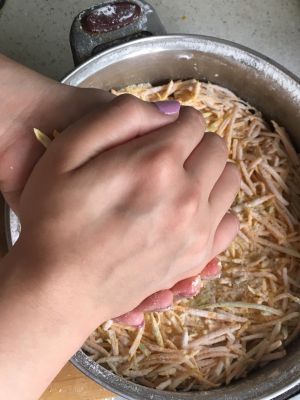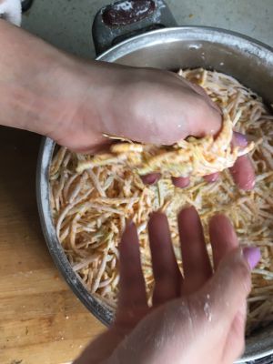 糯米粉加入南瓜丝搅拌,注意一点水都不加,绊好后就像图片这样,最后放入白糖,白糖一定要在要煮的时候才放,不然放早了白糖会化掉生水
