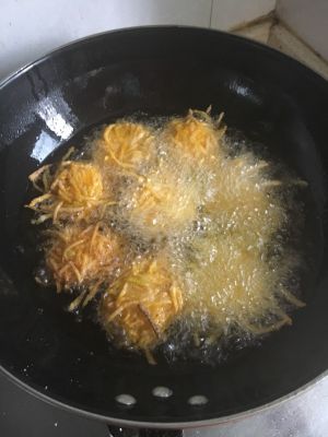 取小团包入芝麻馅,放油锅里小火煎。至金黄色