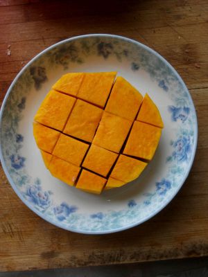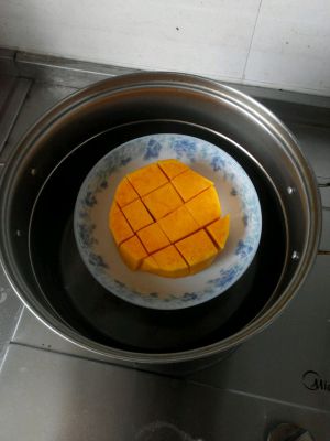 1.南瓜去皮切块放入蒸锅里面蒸熟,然后将南瓜捣成泥散热。