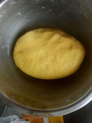 糯米粉和蒸熟的南瓜一起揉成面团。(南瓜放的时候要一点一点放,揉的面要很硬,这样蒸的时候不会软的塌掉。一定要注意硬了好)