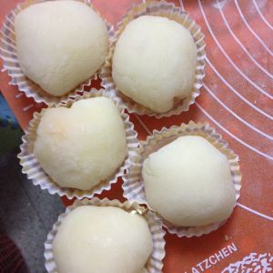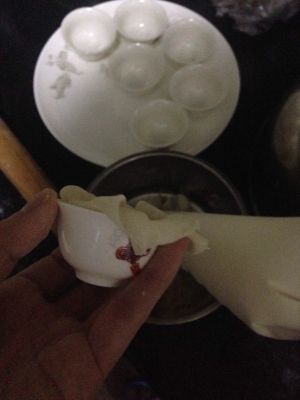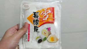 用擀面杖将雪梅娘粉团擀成适合的片,加入奶油和水果包好。可以借助小碗。
