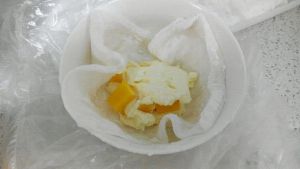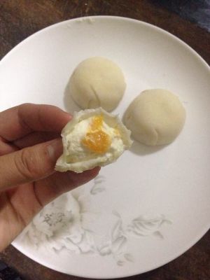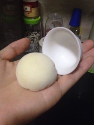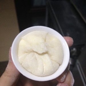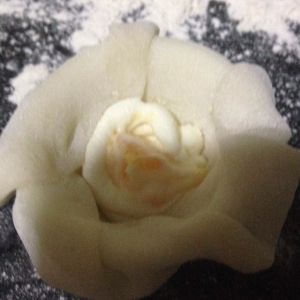 在面皮上放入适量打发好的淡奶油,半颗草莓,再铺上一层淡奶油,然后用包包子的方法收口;(下次尝试整颗的草莓,那样成品的形状应该会更加挺立,剖面也更加美观)