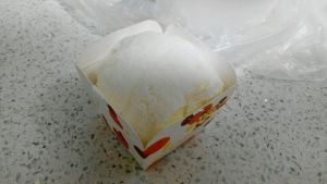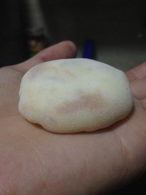 成品!不错吧!亲们还可以用水磨糯米粉加澄粉的配方试试,我也做过,一样不粘手的,面糊不能太稀,太稀会粘。