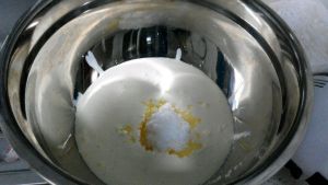 将奶粉和细砂糖放入容器中,加入温水,搅拌均匀至无颗粒,加入已过筛的125g糯米粉和玉米淀粉,搅拌均匀后过筛2次至细腻无颗粒的面浆