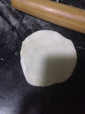 手上摸熟糯米粉,取一部分晾凉面团擀薄。跟饺子皮差不多薄