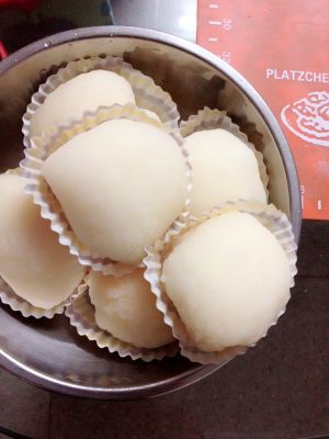 放入蒸锅,倒入适量的热水,大火蒸15-20分钟,蒸好后取出,将黄油放入的面糊中溶化后搅打均匀;等待面团完全冷却,冷却期间可以炒制手粉、准备清洗草莓,打发奶油的工作;(100g糯米粉放入无水的锅中,小火炒至淡黄色即可/草莓洗净去蒂,擦干水分,切半/淡奶油加入糖粉打发);面团完全冷却后,双手沾取适量手粉拍匀,取适量面团放入手中压成圆形的薄皮,放入干净无水的碗中