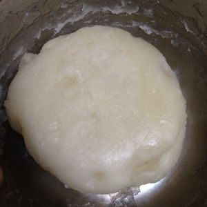 加入热水,糖粉搅拌成糊状,上锅蒸20分钟,出锅加入黄油,搅拌成团!