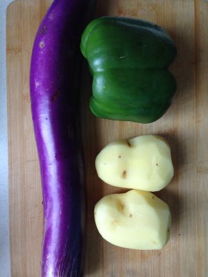 土豆去皮切滚刀块,茄子洗净切滚刀块,青椒洗净用手掰成小块。