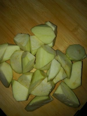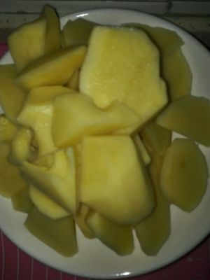 茄子去皮,切一厘米宽厚3厘米长,土豆削皮滚刀切,胡萝卜切片。切好后备用。