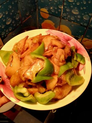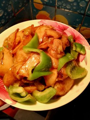 放入青椒翻炒一下,倒入水淀粉,翻匀,菜变得黏稠即可出锅。