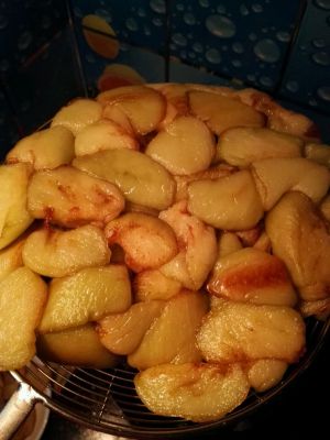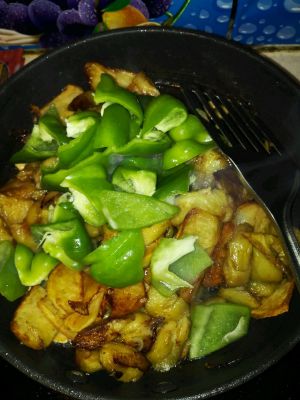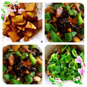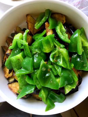 入油锅炸。记住先下土豆,这样不会嘣油,圆椒可以晚点放。土豆炸熟基本就可以出锅了,滤掉多余的油。 (不要炸的特别软,要不然回锅茄子就成泥了)