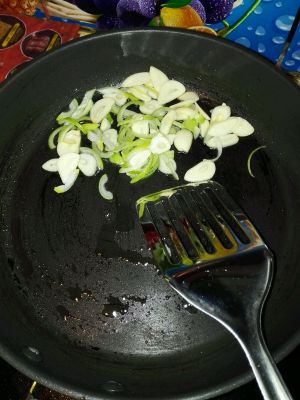 菜炒好后,放鸡精,蒜,葱。把菜盛入锅巴盘子里,就OK了。