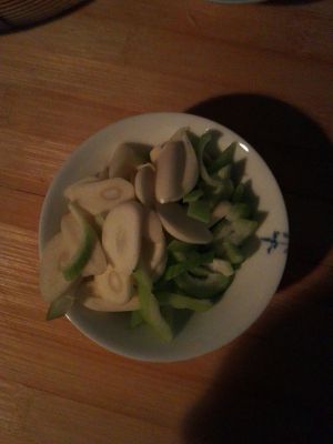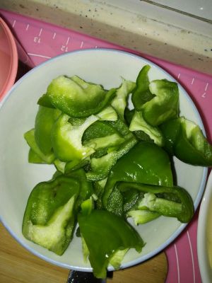 茄子和土豆切滚刀,浸泡半小时,滤干水分,圆椒切块。