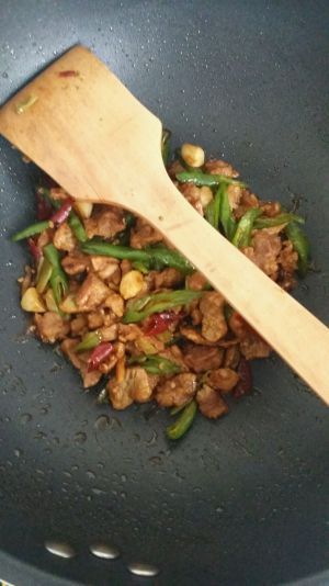 加入腐竹辣椒翻炒,根据口味加入盐,我加的白糖提鲜没用鸡精味精其他调料