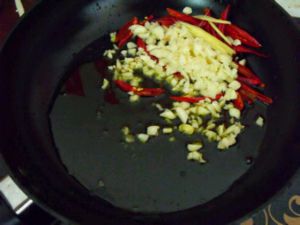 爆好后放豆瓣一勺,加入葱姜蒜翻炒两下